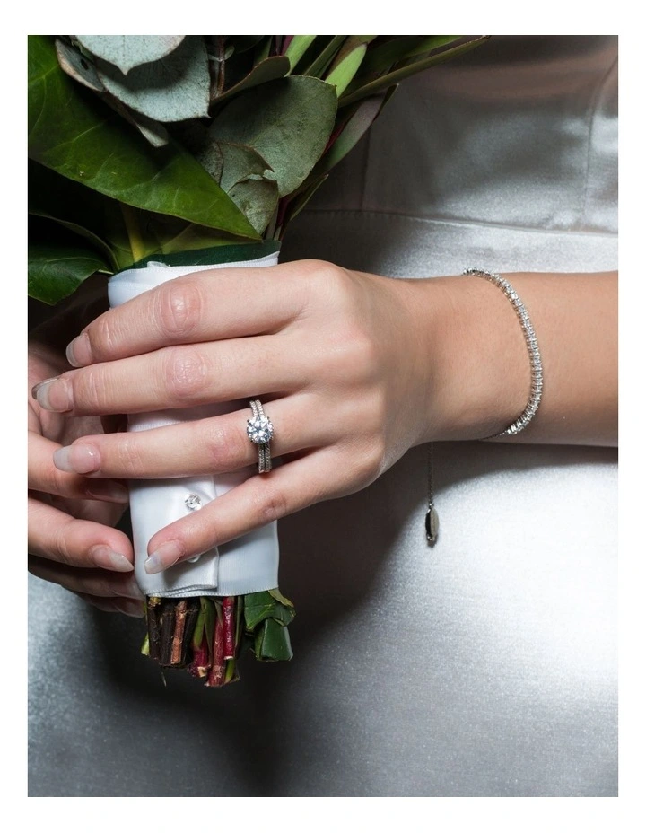 The Anne wedding band by Georgini has been designed to fit with both the Francesca and Violet rings.Β You can however wear it as a simple band alone or stack it with your favourite stackers to add additional sparkle and shine. Measures approximately 1.8mm wide. Crafted in Rhodium plated 925 Sterling Silver.