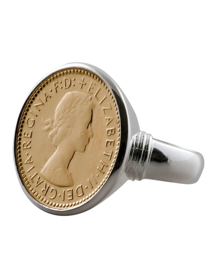 From Von Treskows iconic coin collections, the authentic Australian sixpence coin ring. This piece includes a real Australian sixpence coin encased within sterling silver and set into its band.
