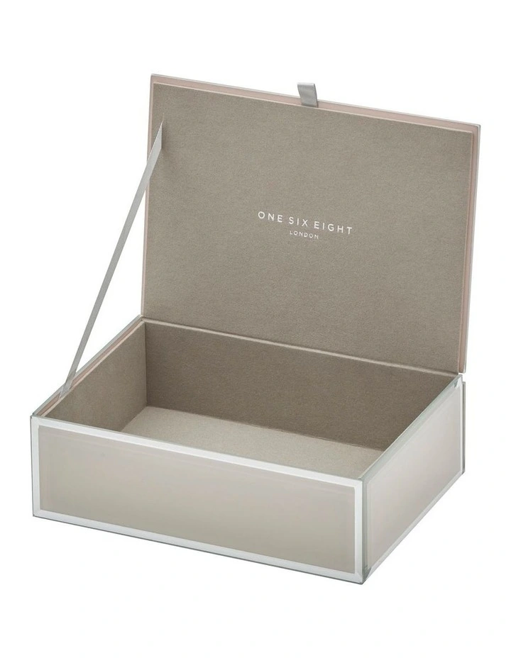 Stash trinkets and treasures galore in this luxurious-looking jewellery box. It’s like a jewel itself, crafted from gleaming glass with Art-Deco-inspired bevelled edges and shimmering contrast trim. The classic shape will fit neatly on your vanity table and bring a touch of vintage glamour to your room. Lift the lid to reveal your prettiest possessions resting on a sumptuous black velvet lining. Choosing your accessories has never been such a delight.