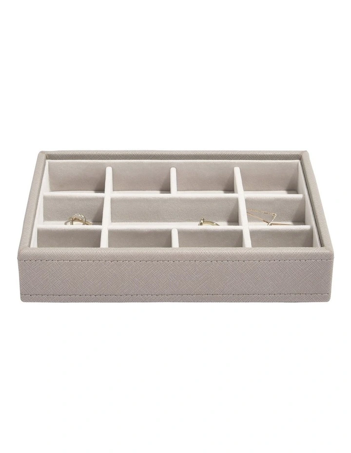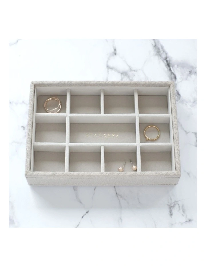 Stackers jewellery boxes are designed so you can create your own by choosing which layers and accessories best suit your unique collection. The Taupe Mini Small Trinkets Layer is made with Vegan Leather & Velvet The small trinkets layer is perfect for all your earrings, rings and charms. With 11 individual sections, it?s the ideal way to keep those small jewellery pieces organised. Top tip: Keep your thin chains tangle free by giving each one its own section. Size: 180x125x35mm